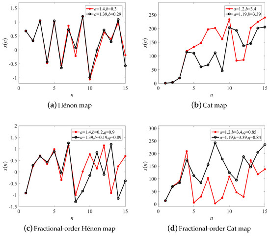 Since chaotic systems are highly sensitive to variations in initial conditions, their long-term trajectories are impossible to predict from a given set of initial conditions. Trajectories of the Hénon map, the Cat map, and their fractional form with different parameters are illustrated in Figure 5a–d, respectively. When the difference of system parameters was just 0.01, systems produced utterly different trajectories with increasing iterations. Nevertheless, the two trajectories were similar before the iteration , because the behavior of the chaotic system can be predicted in the short-term [46]. Therefore, the following numerical simulations were tested with the number of samples and 4, respectively.