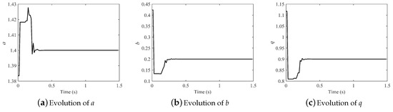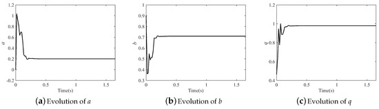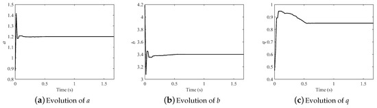 The evolution of the parameters in the fractional-order Hénon map is illustrated in Figure 7 (). All the parameters can be identified consistently with the original after about only 0.35 s. Results demonstrate that the effect was strong and the convergence rate fast.