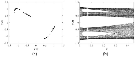 Dynamical behaviors of the fractional-order Hénon map. (a) Attractor with ; (b) bifurcation diagram with a, and .