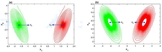Therefore, the Hopf bifurcation of the system (2) at equilibrium point is nondegenerate and supercritical. Furthermore, the equilibria and are symmetric about the axis, hence, the system (2) should also undergo a Hopf bifurcation at . Two numerical simulations are given in Figure 3. For , the orbit of the system (2) with the initial values is attracted to the stable equilibrium point , whereas the orbit with the initial values is attracted to the other stable equilibrium point , as illustrated in Figure 3a. In Figure 3b, by choosing with the initial values and , the orbits of the system are attracted to stable limit cycles emerging from and , respectively.