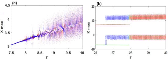 Bifurcation diagrams versus parameter r for illustrating the two and three coexisting attractors of the system (2): (a) , , for the initial values (red) and (blue); (b) , , for the initial values (blue), (red) and (green).