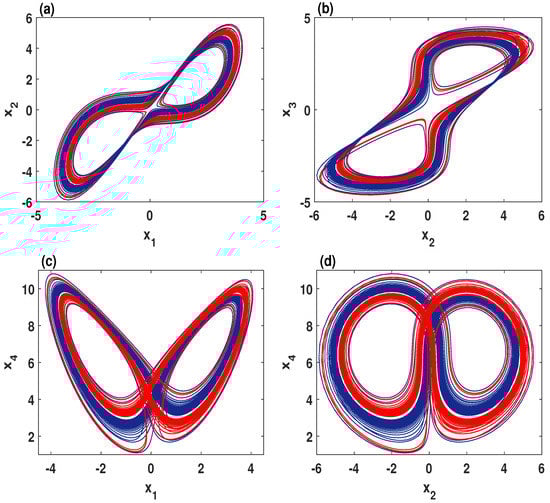 Multiple coexisting chaotic attractors of the system (2) when , , , for the initial values (red) and (blue). (a) – plane; (b) – plane; (c) – plane; (d) – plane.