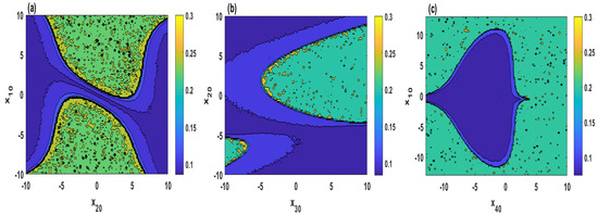 Figure 7 plots SamEn of the system (2) in a two-dimensional plane when and different initial values. It can be observed from Figure 7a–d that four cases are analyzed when the initial values are set as , , and , respectively. From Figure 7, it can be seen that the parameter r and the initial values in the blue regions have smaller SamEn values, which means that the system (2) shows periodic state, whereas, those in the yellow and green regions lead to a chaotic state. Furthermore, Figure 8 shows the chaotic and periodic regions of system (2) when two of the initial values vary simultaneously.