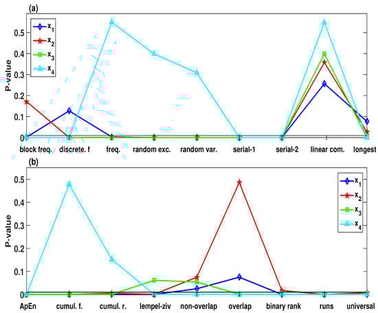 The statistical tests NIST SP800-22 of the pseudorandom number generator (PRNG) that generated by , , , of the system (2) with , , , and for the initial values . (a) Block-Frequency, Discrete Fourier Transform, Frequency (Monobit), Random Excursions, Random Excursions Variant, Serial-1, Serial-2, Linear Complexity, and Longest Run of Ones, respectively; (b) Approximate Entropy, Cumulative Sums (Forward), Cumulative Sums (Reverse), Lempel-ziv Compression, Non-overlapping Template, Overlapping Template, Binary Matrix Rank, Runs, and Universal Statistical.