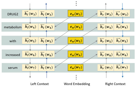The bidirectional recurrent structure used for obtaining the actual semantic embedding of each word. This figure is a partial example of the sentence “DRUG1 modifies DRUG2 metabolism with increased serum levels of DRUG0.” (DDIExtraction 2013 dataset, file Acetazolamide-ddi.xml, sentence DDI-DrugBank.d368.s0).