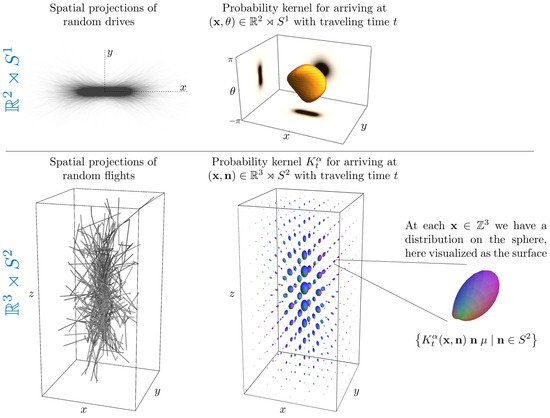 Various visualization of the diffusion process () on , for and . (Top) random walks (or rather “drunk man’s drives”) and an iso-contour of the limiting diffusion kernel, for the case studied in previous works (see, e.g., [15,37,83]); and (Bottom) random walks (or rather “drunk man’s flights”) and a visualization of the limiting distribution for the case . This limiting distribution is a degenerate diffusion kernel that we study in this article. We visualize kernel by a spatial grid of surfaces, where all surfaces are scaled by the same .