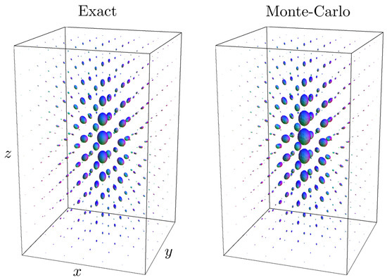 This generalization allows for heavy tailed distributions of -stable Lévy processes, which arise in a fundamental generalization [61] of the central limit theorem where one drops the finite variance condition. Here, we note that recently an extension of the central limit on linear groups (such as ) has been achieved for finite second-order moments [56]. In engineering applications, where (iterative group-)convolutions are applied ([4], ch.12 and 13, [9,12,13,67,68,69,70,71]), the “kernel width” represents the spread of information or the scale of observing the signal. In the case the applications allow for an underlying probabilistic model with finite variances, variance is indeed a good measure for “kernel width”. However, often this is not the case. Probability kernels for stochastic Lévy processes (used in directional statistics [72], stock market modeling [73], natural image statistics [65]), and modeling of point-spread functions in acquired images (e.g., in spectroscopy [74])) do require distributions with heavier tails than diffusion kernels. Therefore, “full width at half maximum” is a more generally applicable measure for kernel width than variance, as it applies to all -stable Lévy processes. The probability distributions for encode a longer range of interaction via their heavy tails and still allow for unlimitedly sharp kernels.