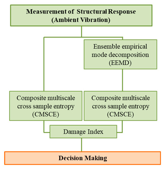 The aim of this study was to develop an entropy-based SHM system for solving the problem of unstable entropy values observed when multiscale cross-sample entropy (MSCE) is employed to assess damage in laboratory-scale structure. The flowchart of the study procedures is shown in Figure 1. The proposed system was validated by simulating the ambient vibration response of a seven-story model and conducting a steel structure experiment. The health condition was first detected by the ambient vibration response through CMSCE. Moreover, as most of the practical damages were observed on the lower part of a structure under earthquake excitation, monitoring the change of the first fundamental mode frequency is an alternative way for rapid screening. Therefore, ensemble empirical mode decomposition (EEMD) was attempted to extract the first mode of structural response to evaluate the feasibility of detecting damage according to only the first mode [26]. A previously proposed damage index (DI) was used to efficiently quantify damage, and the decision of damage location and condition was made.