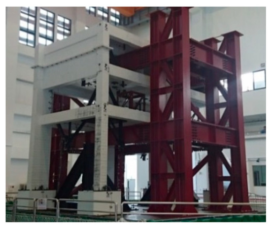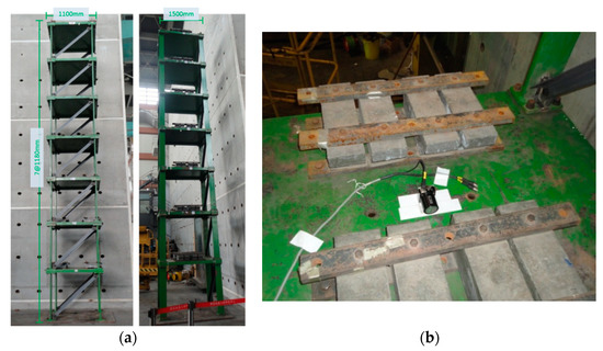 To verify the practicality of the SHM system, an ambient vibration experiment for a scaled-down steel benchmark structure was conducted. The number of damaged cases was designed to be identical to that of the aforementioned numerical simulation. Moreover, the characteristics of the experimental structure were similar to those of the numerical model; the height of each floor was 1.1 m, and the widths of each floor were 1.5 and 1.1 m. An additional mass of 500 kg (Figure 17b) was added to each floor to simulate the actual structural characteristics. An L-shaped steel angle measuring was selected as the bracing.
