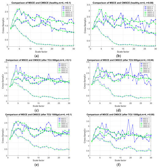 Comparison diagram of MSCE and CMSCE for: (a) healthy condition with m = 4, r = 0.1; (b) healthy condition with m = 4, r = 0.08; (c) after TCU 800 gal with m = 4, r = 0.1; (d) after TCU 800 gal m = 4, r = 0.08; (e) after TCU 1000 gal with m = 4, r = 0.1; (f) after TCU 1000 gal with m = 4, r = 0.08.