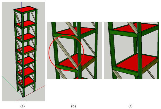 After the comparison of the MSCE and CMSCE algorithms through the shaking table test, the advantage of CMSCE for SHM was validated. Subsequently, a numerical simulation was executed to assess the feasibility of using CMSCE on more complex structures. SAP2000 software was used to construct and analyze a seven-story model for numerical simulation. Regarding geometric properties, the model was a steel structure with a yield strength . The height of each story was 1.06 m, and the floor widths on the x- and y-axes were 1.32m and 0.92 m, respectively. The beam was a steel plate measuring . The column was a steel plate measuring . Steel bracings were set up on the y-axis and selected as L-shaped steel angles of . Moreover, an additional mass of 500 kg was added to each floor to simulate real structural behavior. Structural damage was simulated by removing the bracings symmetrically. The SAP2000 model and damage scenario are shown in Figure 5.