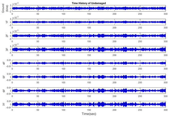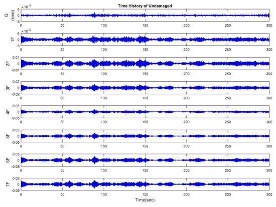 Time history analysis was performed using a white noise signal of 1 MW power as the input acceleration to simulate the response of the structure under ambient vibration. The sampling rate was 200 Hz for 300 s. After the database had been created on the basis of the time history analysis of each damaged case, the velocity response data, which is relatively sensitive for ambient vibration, were extracted from the center of each floor on the y-axis [31]. The responses of velocity signals in the undamaged case are shown in Figure 6. All damaged cases and the modal analysis results are presented in Table 1.