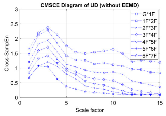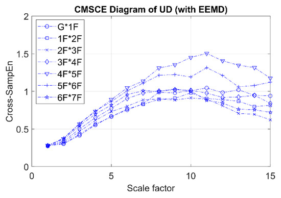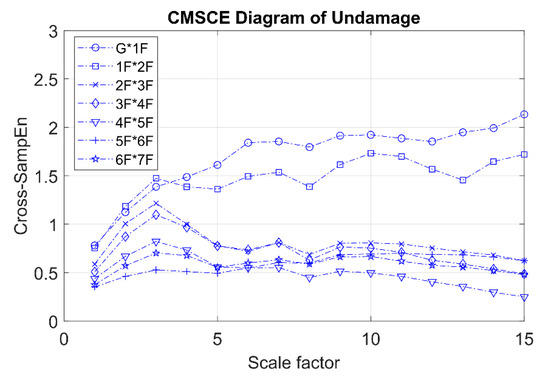 Figure 12 presents the CMSCE diagram obtained through EEMD for the undamaged case. G*1F denotes the curve for the first floor and 1F*2F denotes the curve for the second floor; the curves for the remaining floors follow similar designations. The entropy gradually increased with the time scale and reached a plateau at scale 10, where information richness could be accumulated if the system responded well. Moreover, the complexity rankings did not follow the order of the floors from low to high. Complexity was fairly consistent, except for the curves for the fourth and fifth floors.