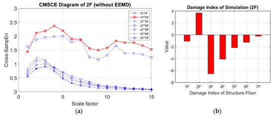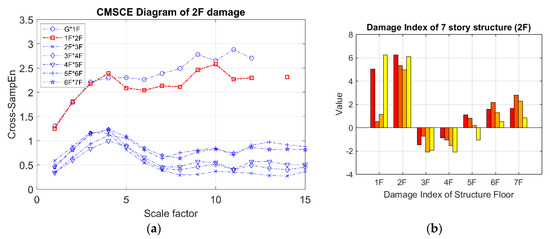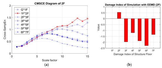 (a) CMSCE diagram of damage on the second floor (2F) with EEMD; (b) Damage index of damage on the second floor with EEMD.