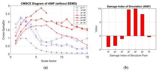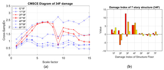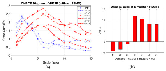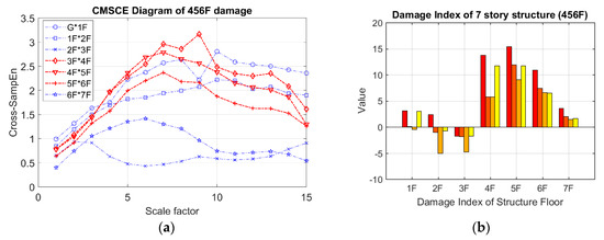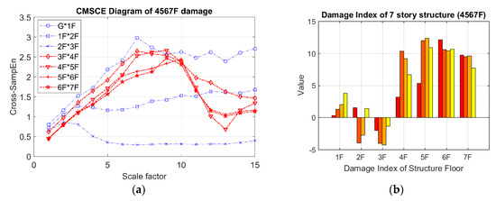 The CMSCE diagram for multistory damage is illustrated in Figure 16a. The curves for the fourth floor to the seventh floor gradually ascended and reached a plateau at scale 10. However, a comparison of the results in Figure 16a with those for the undamaged case (Figure 12) revealed that the overall entropy values were almost identical, signifying that the damage location could not be detected by applying the first mode signal. The obscure change in the CMSCE diagram resulted in a failure to diagnose the damaged floor in the DI results.