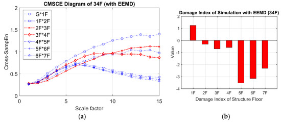 (a) CMSCE diagram of damage on the third and the fourth floor (34F) with EEMD; (b) Damage index of damage on the third and the fourth floor with EEMD.