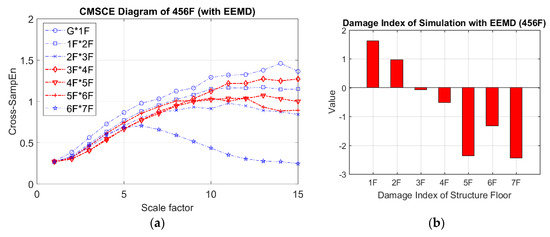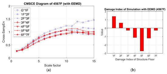 (a) CMSCE diagram of damage from the fourth to the seventh floor (4567F) with EEMD; (b) Damage index of damage from the fourth to the seventh floor with EEMD.