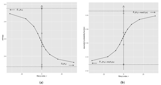 - That everything can be written in terms of the extreme values of the entropy, e.g., . This is suggested by Properties 3.1 and 3.2. Supposing we had a way to estimate either or . Then by a divide-and-conquer type of approach it would be feasible to extract all the probabilities of a distribution out of its Rényi entropy function.