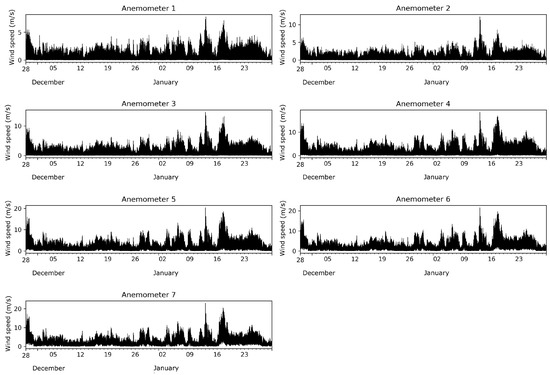 A meteorological mast of 27 m in height, where seven sonic anemometers (Gill Wind Master) are located, each 4 m, has been installed on the EPFL campus. The first anemometer is mounted at 1.5 m (corresponding to the average height of the center of an adult), while the last one is at 25.5 m above the ground. It can be noted that the highest sensor was placed far enough above the building layout height to be in the inertial layer [17]. The three velocity components, the sonic speed, and temperature were measured. The frequency of the data is 1 Hz [18]. In this study, the wind speed and the sonic temperature are analyzed for each level on the tower. The atmospheric pressure is measured at the site, with a Gill meteorological station (GMX300), also with a frequency of 1 Hz. The time series of the wind speed data, collected during a two-month period from 28 November 2016–29 January 2017, are shown in Figure 2. Figure 3 shows histograms along with kernel density estimations [19,20]. Summary statistics are given in Table 1.