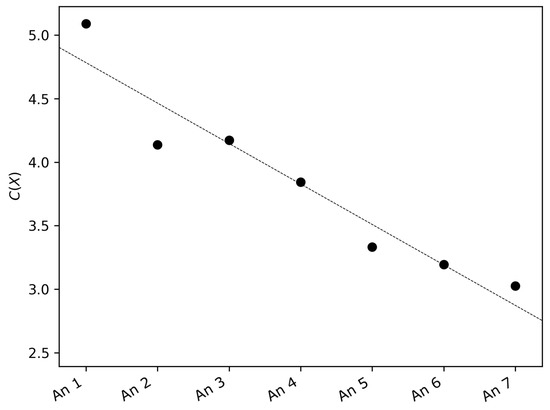 For each series, the FIM, the SEP, and the FS complexity were calculated. As an example, the bandwidth values are reported in Table 2. The FS complexity for each anemometer is shown in Figure 4. It is evident that there was a decreasing pattern of the FS complexity with height increasing from the ground. The largest value was reached at the anemometer placed at 1.5 m and the smallest for the one placed at 25.5 m. In particular, this decrease shows a non-linear relationship of wind speeds across height; otherwise, the FS complexity would be constant.