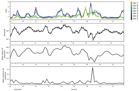 To see if any link could be found between the daily variations of the FS complexity with meteo-climatic variables, the daily mean and variance of the ambient pressure (Figure 5) and sonic temperature (Figure 6) were calculated. Showing synoptically the daily variation of the FS complexity and the daily variation of the mean pressure and sonic temperature, we can observe that most of the peaks of the FS complexity seemed to have a qualitative correspondence with those of the mean pressure, while no apparent correlation with the sonic temperature mean was observed.