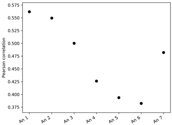 Pearson correlation between daily FS complexity and daily variance of sonic temperature at the seven levels of the mast.