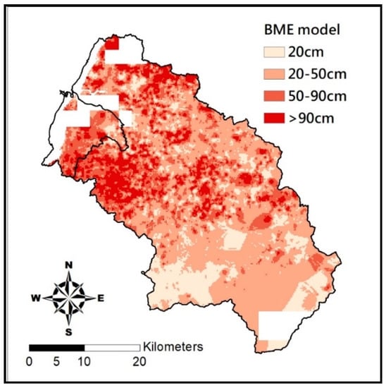 The input data of BME may contain hard data and soft data. The hard ones are soil depth measurements, while the soft ones are soil depth estimated from the built prediction model, such as Kriging with input of the soil depth measurement and their relevant physiographic factor on the DEM. After all estimates are included, set soft data to low frequency (data trend) and deduct it from the hard data to obtain high frequency (data residual); consider the covariance distribution of data residual as the input of the BME method to estimate soil depth residual difference of unknown points; combine the latter with the data trend established earlier to build the final distribution of soil depth in space.