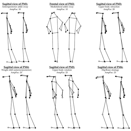 Visualization of the first six principal movements (PM1–PM6) of the tandem stance with respective amplification factors (AmpFac). For each PM the minimal and maximal deviation from the mean posture are displayed.