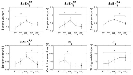 The post-hoc analysis of the statistically significant results of Table 2 revealed significant differences between 0-back and 2-back conditions in the sample entropies of the PP5 and PP6 (: +12% (ST to DT2), p = 0.004; and : +11% (ST to DT2), p = 0.039). Furthermore, significant effects were found between 2-back and 4-back DT in the sample entropy of PP6 (: −9% (DT2 to DT4), p = 0.012) and the first two PAs (: −3% (DT2 to DT4), p = 0.023; and : −2% (DT2 to DT4), p = 0.020). The variables N5 and σ2 displayed differences between two DT-condition each (N5: −4% (DT1 to DT2), p = 0.026 and σ2: −3% (ST to DT4), p = 0.021). No statistically significant effects were found in the post-hoc analysis of N6.