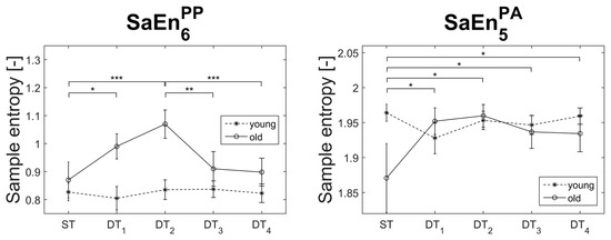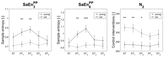 Descriptive statistics of the variables that displayed age effects. stands for sample entropy of the principal position PP or principal acceleration PA and PMk for the kth principal movement. Nk stands for the number of control interventions in the kth component. Significant post-hoc results are symbolized with asterisks. ST = single task; DTn = dual task with n-back auditory working task.