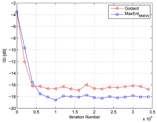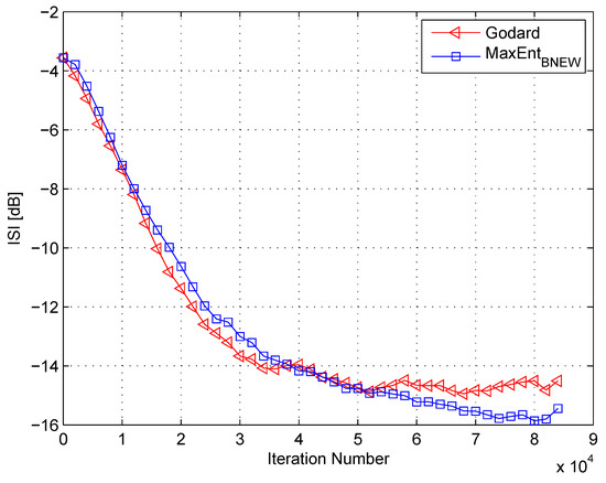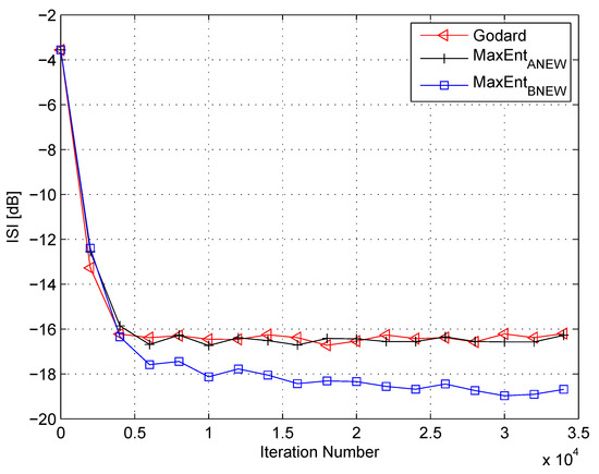 In my simulation, the equalizer’s length was set to 13 taps. For initialization purposes, the center tap of the equalizer was set to one while all others were set to zero. As a source input, I used the 16QAM constellation. The equalization performance comparison between the new proposed equalization method (“” (46)), the maximum entropy [49], and Godard’s [53] algorithm is given in Figure 2, Figure 3 and Figure 4. The equalization performance comparison was carried out for a 16QAM constellation input sent via Channel 1 with SNR values of 10 dB, 7 dB, and 0 dB, respectively. It should be pointed out that the results in Figure 2 and Figure 3 for “” and “” were reproduced from Reference [49]. In addition, please note that according to Reference [49], “” is not applicable for dB. According to Figure 2, Figure 3 and Figure 4, the new proposed algorithm (“” (46)) has a better equalization performance from the residual ISI point of view compared to “” and “”. Next, I tested the proposed equalization method (“” (46)) with Channel 2 and Channel 3 where . Figure 5 and Figure 6 show the equalization performance comparison between the new proposed equalization method (“” (46)) and Godard’s [53] algorithm for the 16QAM constellation input sent via Channel 2 and Channel 3, respectively, with dB. According to Figure 5 and Figure 6, the new proposed algorithm (“” (46)) has a better equalization performance from the residual ISI point of view compared to “”. As a matter of fact, for the case of (Channel 2), the improvement in the residual ISI compared to the results obtained by “” is approximately 5 dB while the improvement in the residual ISI compared to the results obtained by “” for (Channel 3) is only approximately 2 dB. Thus, we may say that the proposed algorithm (“” (46)) has a promising equalization performance from the residual ISI point of view for channels with .