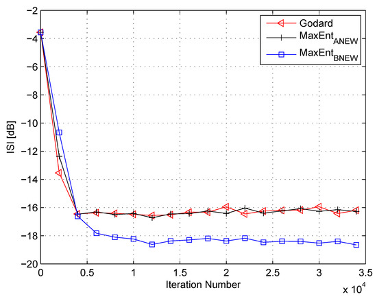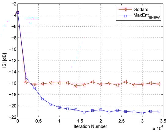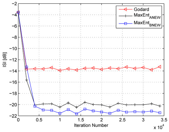 Please note that for the ideal case, when the equalizer has converged, the convolutional noise power tends to zero. Thus, this makes (54) reasonable. In the following, I use (53) and (54) for calculating the Lagrange multipliers related to the “” algorithm. Figure 7 and Figure 8 show the equalization performance of the new proposed equalization method (“” (46) with (53) and (54)), namely the ISI as a function of iteration number for the 16QAM constellation input sent via Channel 1 for SNR values of 10 dB and 7 dB, respectively, compared to the equalization performance obtained from the maximum entropy [49] and Godard’s [53] algorithm. Please note that here the results for “” and “” were also reproduced from Reference [49]. According to Figure 7 and Figure 8, the new proposed algorithm (“” (46) with (53) and (54)) has better equalization performance from the residual ISI point of view compared to the maximum entropy [49] and Godard’s [53] algorithm even when the SNR and channel power are unknown.