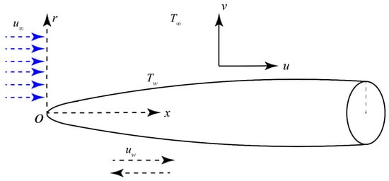 Consider the laminar steady flow of a dissipative fluid over a thin moving needle in a free stream. The thin needle is supposed to be moving with a constant velocity uw and the fluid in a stress-free region is moving with velocity u∞ as shown in Figure 1. Under the stated assumptions, the governing flow equations along with the boundary conditions take the following form [,,,]: