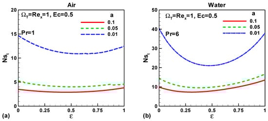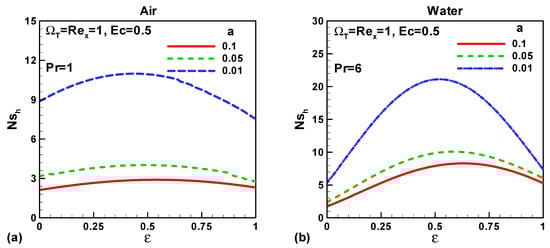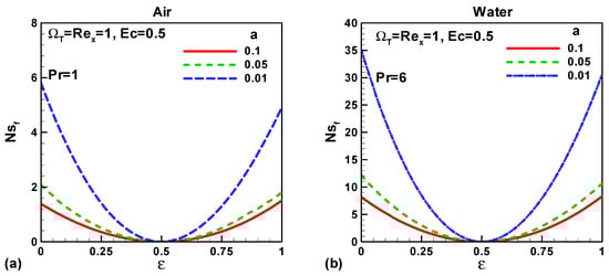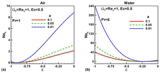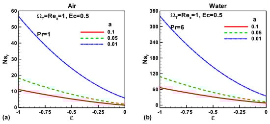 In this section, our key concern is to look at the impacts of the chief physical parameters on the quantities of interest. Therefore Figure 2, Figure 3, Figure 4, Figure 5, Figure 6, Figure 7, Figure 8 and Figure 9 are given. Figure 2a,b show the variation of entropy generation as a result of heat transfer and viscous irreversibility with dimensionless size of thin needle (a) and velocity ratio parameter ε < 0 for both type of fluids (air and water), respectively. It is found that conduction irreversibility increases for both air and water as fluid with decreasing size of the needle. For a fixed thin needle size, the conduction irreversibility increases for air and decreases for water with decreasing (in an absolute sense) velocity ratio parameter. Furthermore, the comparison also reveals that the entropy generated due to heat transfer in water is more than in air and this is because of the high Prandtl number. Similar effects are observed for fluid friction irreversibility as depicted in Figure 3a,b. The total entropy generation (Ns)t increases with the diminishing size of the thin needle as depicted in Figure 4a,b and this is because of the increasing velocity and temperature gradients. Figure 4a,b also reveal that the total entropy generated in water is more than in air. Furthermore, for a fixed value of “a” the entropy decreases as the needle velocity decreases or the free stream velocity increases, so by increasing the free stream velocity or by decreasing the velocity of the thin needle one can minimize the entropy generation, which is the main goal of the second law analysis, the minimization of entropy generation.
