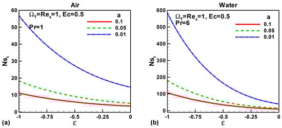 Variation of Nst when (0 < ε < 1) for (a) air and (b) water.