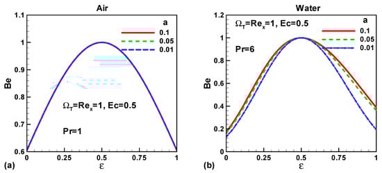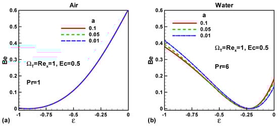 Figure 5a,b describe the variation of Bejan number (Be) with needle size “a” and velocity ratio parameter ε < 0 for air and water, respectively. It is found that the Bejan number is independent of “a” if the working fluid is air. In the case of water, the Bejan number increases with decreasing size of the needle and decreases with the falling values of the velocity ratio parameter (up to ε ≈ −0.25). The Bejan number is less than 0.5 in the case of water therefore the contribution of fluid friction is dominant over the contribution of heat transfer as shown in Figure 5b.