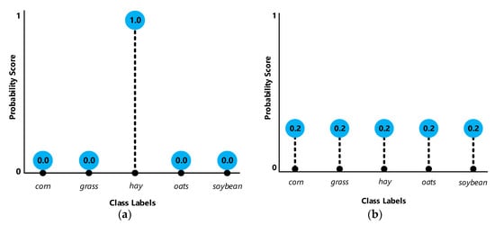 The most popular and accurate way of uncertainty assessment is based on a supervised scheme using a machine learning algorithm. Here, we implemented a model that can assess the uncertainty values of a classified hyperspectral image containing various class labels. We first collected ground truth data labelled with their class categories such as corn, grass, hay, oats, and soybean. During training, the algorithm was provided with a training example and produced a response in the form of a vector of probabilities, one for each class. Then, the best-case scenarios would be the highest probability score for one class and the lowest possible probability score for the other remaining classes. The least desirable case, on the other hand, would be equal probability scores for all the existing class labels (Figure 2). We then computed the uncertainty of probability scores for all potential class labels for a pixel by using entropy. An ideal algorithm, for uncertainty assessment, is not only capable of classifying input data with the highest possible accuracy but also capable of producing class labels with low uncertainty for correctly classified pixels and vice versa.