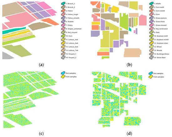 Ground truth data of two datasets including the Salinas (a) and the Indian Pines (b). The bottom images represent the location of the train and test data for the Salinas (c) and the Indian Pines (d).