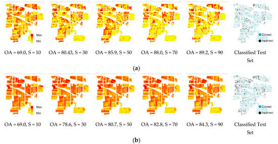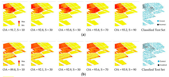 Results of uncertainty assessment for DNN (a) and RF (b) using different portions of training sample (S, in %) and mode of correct/incorrect classified test data for the Salinas dataset. The estimated overall accuracy (OA, in %) of the whole classification scheme is also demonstrated for each training sample.
