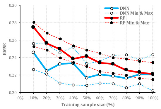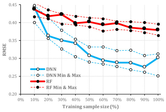 The higher accuracy of DNN elevates the quality of implemented uncertainty assessment for locating correct/incorrect classifications for this dataset. Nonetheless, to quantify the difference in the quality of uncertainty the assessment between the two algorithms, the RMSE values were estimated for every training sample. The RMSE values also confirmed the superiority of DNN for the majority of training sample sizes in a way that less uncertainty was estimated for correct classified pixels while incorrect classified pixels were identified by more levels of uncertainty. However, the same as the Salinas dataset, RMSE values derived from five consecutive simulation runs of RF are more consistent. This can be easily observed by comparing the difference between the minimum and maximum RMSE values for each sample size that is observable in Figure 8. Obviously, DNN is coupled with more variation between minimum and maximum RMSE values for almost all different sample sizes.