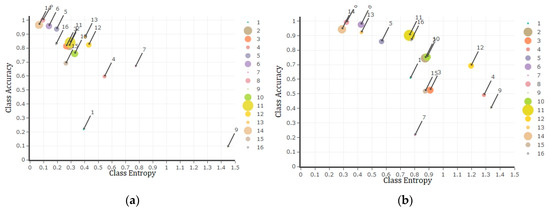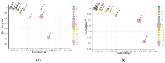 Class entropy/uncertainty (x-axis) versus class accuracy (y-axis) plots of Salinas dataset using DNN (a, left) and RF (b, right) algorithms observed by applying 50% of training data. The bubble sizes represent the frequency of land use class labels while bigger bubbles indicate the higher frequency and vice versa.