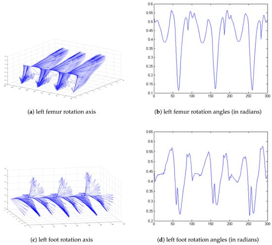 Axis and angle of rotation of femur and foot segments during gait (three strides).