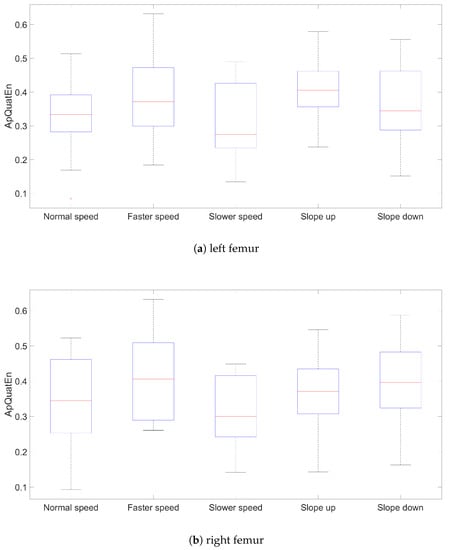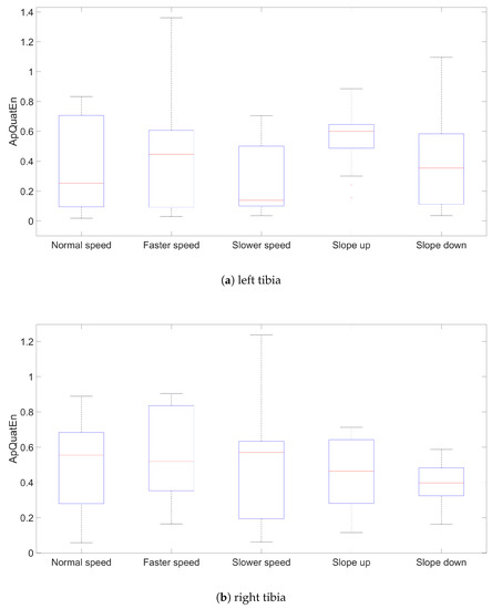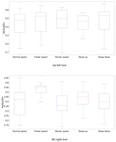 The results for (, ) are presented using box plots comprising all three segments for left and right side, speed and slope (Figure 2, Figure 3 and Figure 4). The other parameters’ configurations give results presenting similar dependencies. The influence of parameters to result in quaternion approximate entropy is presented in Figure 5. Movements of all considered body parts and experiments configurations are characterized by the positive value of entropy, which detect and quantify chaotic behavior. This is consistent with results obtained with use of in [], for which all times series are characterized by positive values of . The median values for all segments are also presented in Table 1. In addition, the aggregated median values for segments without taking into account the side of the body are included.