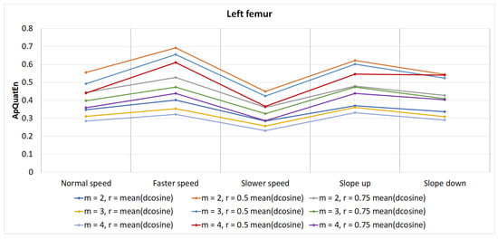 The detailed influence of lengths of vector m and value of threshold r into result for left femur segments is presented in Figure 5. All values of entropy have similar dependencies within experiment configurations and segments. Generally, the for is smaller than for . This means that differences between and are smaller than and . Typically, it is suggested that, for clinical data, m is to be set at 2 when utilizing the algorithm [].