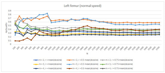The value of entropy for left femur segments (Normal speed) (, ) in relation to data length N.