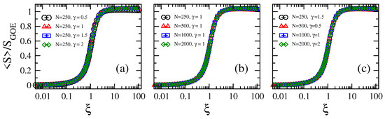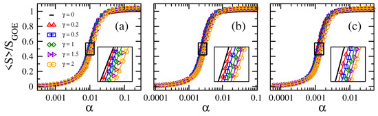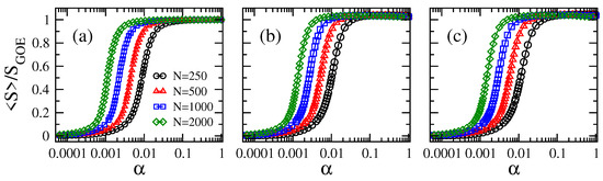 With Definition (4), when for any , since the eigenvectors of the (diagonal) adjacency matrices of our random network model have only one non-vanishing component with the magnitude equal to one, then . On the other hand, for and , the GOE is reproduced, and ; i.e., the random eigenvectors extend over the N available vertices in the network. We note that for and , our random network model does not reproduce the GOE and ; however, we observe that , so we use as the reference information entropy.