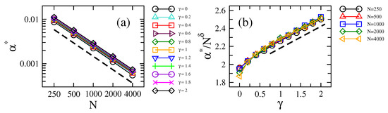 Localization-to-delocalization transition point (defined as the value of for which ) as a function of (a) the network size N (for several values of ) and (b) the loss-and-gain strength (for several values of N). In (b), we set to −0.98. Dashed lines in (a) and (b) proportional to and , respectively, are plotted to guide the eye; see Equations (5) and (6).