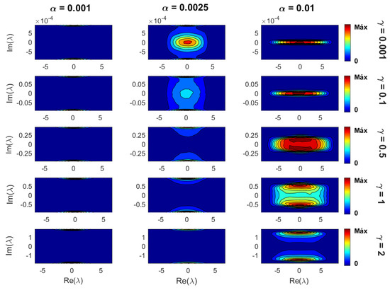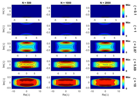 Finally, for moderate values of , as reported in Figure 5 (central panels), the combination of the two situations described above occurs: for small , the eigenvalues form three clouds in the complex plane, two thin ones close to , and a third one with the center at the origin of the complex plane; for increasing , the middle cloud gets wider and splits into two clouds that, for large enough , merge with the thin clouds at .