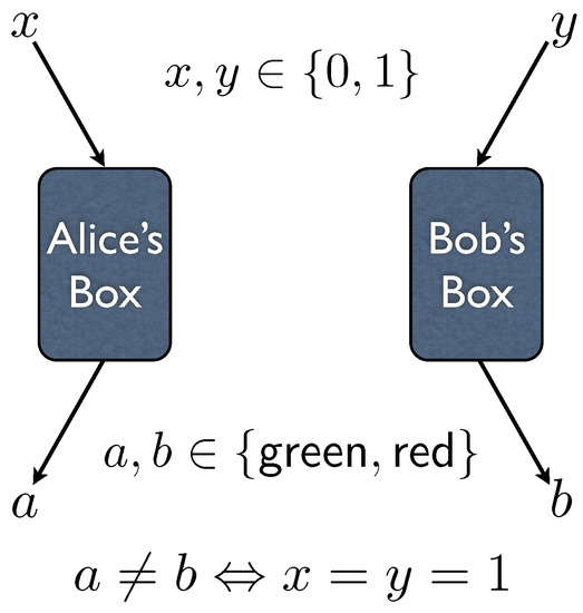 by and , then Alice’s box would flash colour when input button x is pushed by Alice, whereas Bob’s box would flash colour when input button y is pushed by Bob. See Figure 1 again.