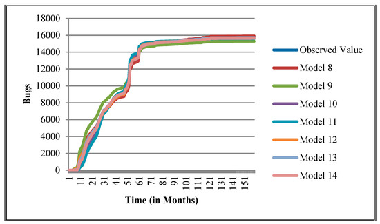 The value of parameters for the models (model 1 to model 14) have been estimated for different products of the Eclipse project. The values of parameters y and p give the potential number of bugs lying dormant in the software. gives the number of bugs fixed. The differences and indicate the number of bugs still lying in the software and this quantity determines the reliability level of the software. It is the quantitative quality measurement of the software product. The parameter value q indicates the proportion of independent bugs. With the help of this parameter, we can find the proportion of independent and dependent bugs still lying dormant in software. The values of β and ψ give the nature of the growth curves. A high value indicates that the bugs are complex and will take more time in fixing. The bug fixing rate tells us about the bug fixing efficiency.